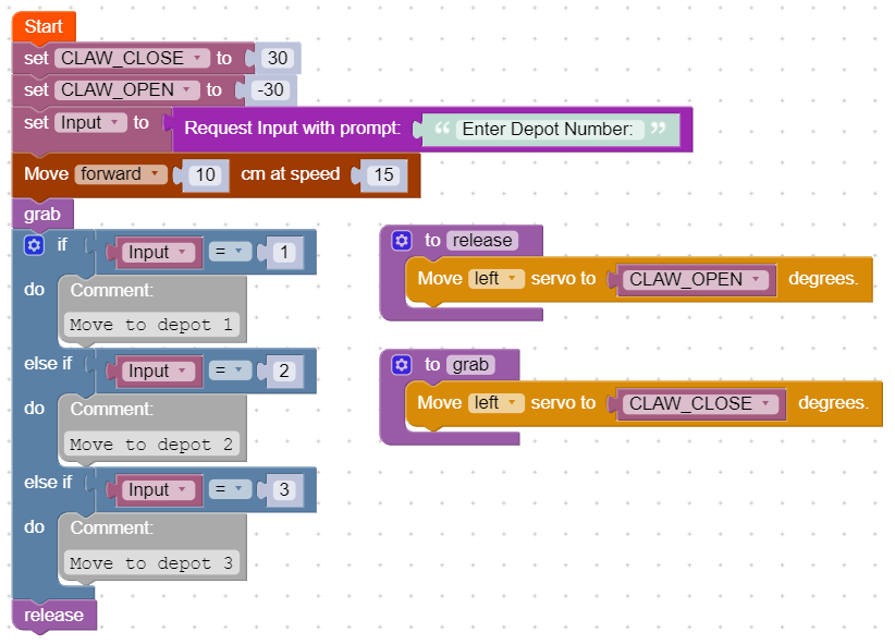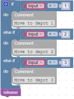 If you’re using colour indicators instead, the input request can be replaced with an ‘if else’ statement that detects the colour and sets the input to a depot number.