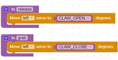 Next, make two functions for ‘grab’ and ‘*release’. *While these functions only have the ‘Move Servo’ block, doing this makes it easier to understand the code.
