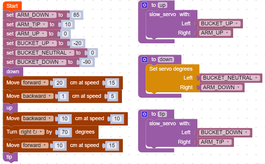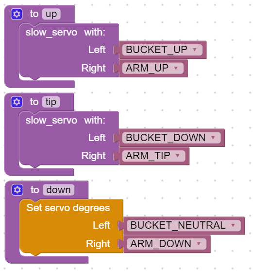 Servo interpolation is a technique we implemented to smooth out the servo movements. This is because if the servos jerk around too much, the digger may drop the load. This technique is optional, as the normal servo block still works. If you wish to use smooth servos, switch to the text editor and copy the code below into it. Then switch back to blocks if desired.