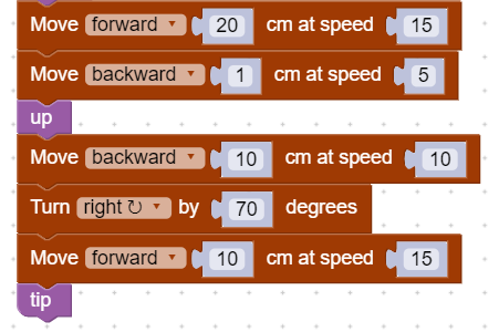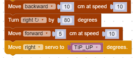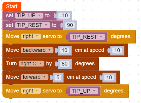 Next, we’ll make some functions to make operating the arm easier. The three functions to be defined are ‘Up’, ‘Tip’, and ‘Down. We define these functions simply to make the code cleaner. Each function is in charge of moving the servos to the correct positions to move the arm up, down, and to tip.