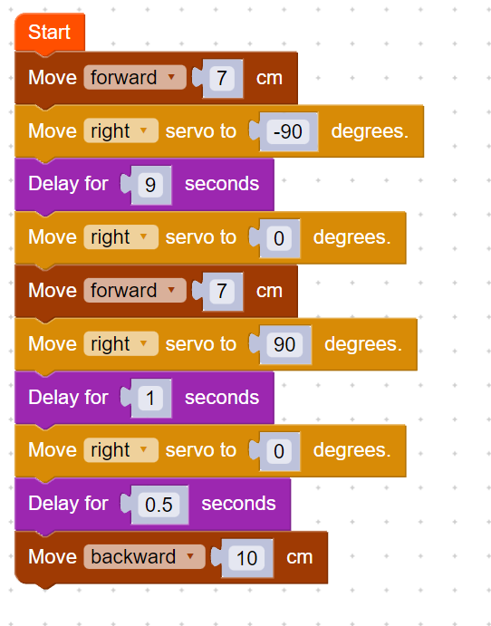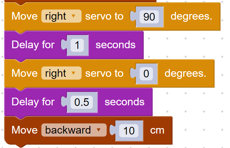 Next, we will set the continuous servo to turn on in one direction by powering it to 90. The delay will choose how long the servo will spin for. We will set the servo to 0 to turn it off.