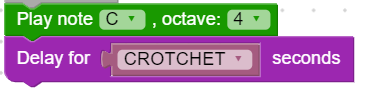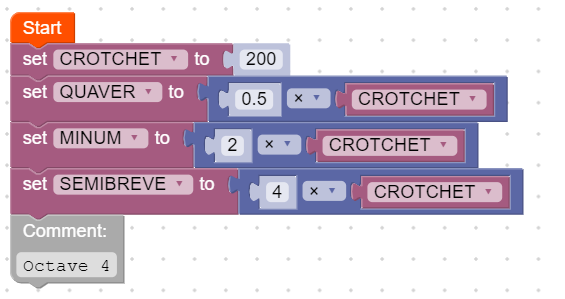 Now we need to start setting up the framework in our code to make music. We’ll begin by setting constants for each of the note lengths. A constant is a value used repeatedly throughout the code that never changes, which is perfect for what we need here. As all the notes are multiples of the Crotchet, we can use the diagram above and some simple multiplication to set all the constants. We also need to decide on an octave to use, so make a comment to remember this. For this example, we’ll use octave 4.
