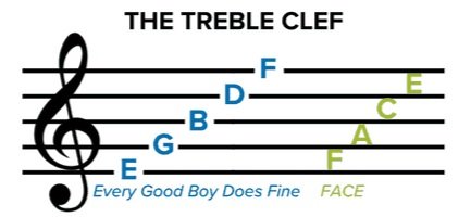 As the image to the right shows, a note can sit on a line or a space. You may find many notes of the same letter (tone) but at a higher pitch (different octave)