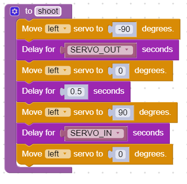 Start by making the ‘servo_out’ and ‘servo_in’ constants. ‘servo_out’ is how long the servo spins to shoot a ball. ‘servo_in’ is how long the servo spins to retract the pusher.