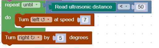 In the main code, the rover spins around until the ultrasonic detects an object within 50cm. Put a ‘Turn Left’ movement block in a while loop that checks the ultrasonic distance. The slower the rover turns, the easier it will be to find the tower, so adjust the speed accordingly.