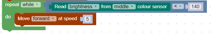 In this stage, the rover moves forward while the brightness reading from the middle colour sensor is low. For our setup, the ground had a brightness of 100 and the white tape had a brightness of 180. According to these values, when the brightness passes halfway from black to white (140), the loop ends.