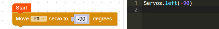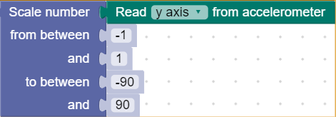 For this activity, we will use the y-axis of the accelerometer as our sensor. The limits of this sensor are [-1, 1]. We will connect this to the output of a servo with limits of [-90, 90]. Fill in the ‘Scale’ block using these values.