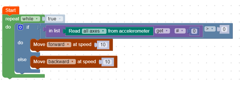 Using an IF statement block, we can check if the x axis of the accelerometer is above or below zero. If its above, we can use a motor block to move forward, otherwise we can use the motor block to move backwards.