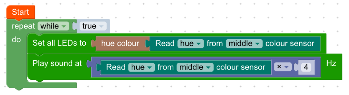 The hue colour sensor block returns a single number. We can program our rover’s buzzer to play sound at a specific frequency (in Hz), which is just a number of vibrations per second. We can place the hue value we get from our colour sensor directly inside our Play Sound block. We multiply this with a math block to make the sound more pronounced. See if you can add to this calculation to make better music.
