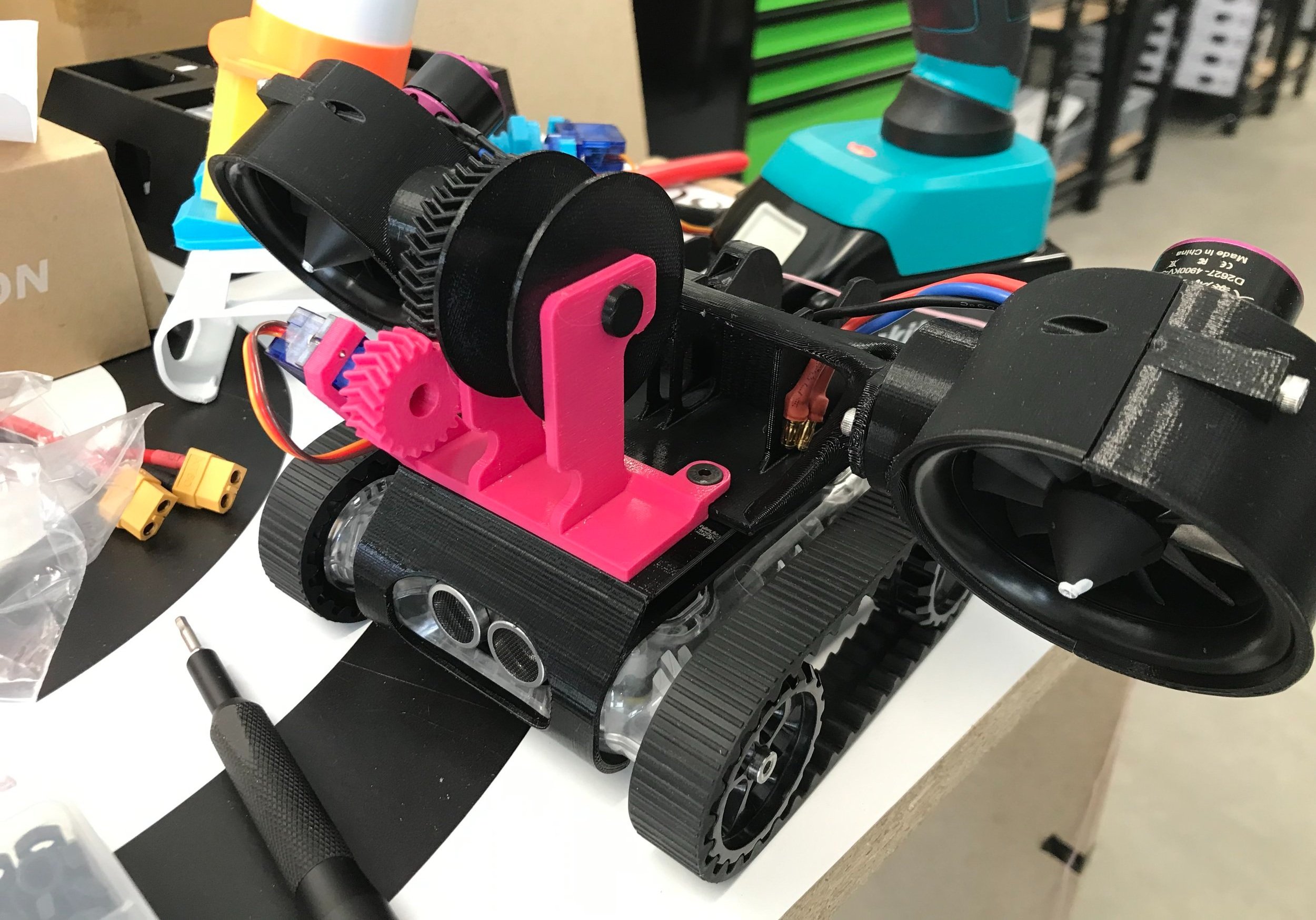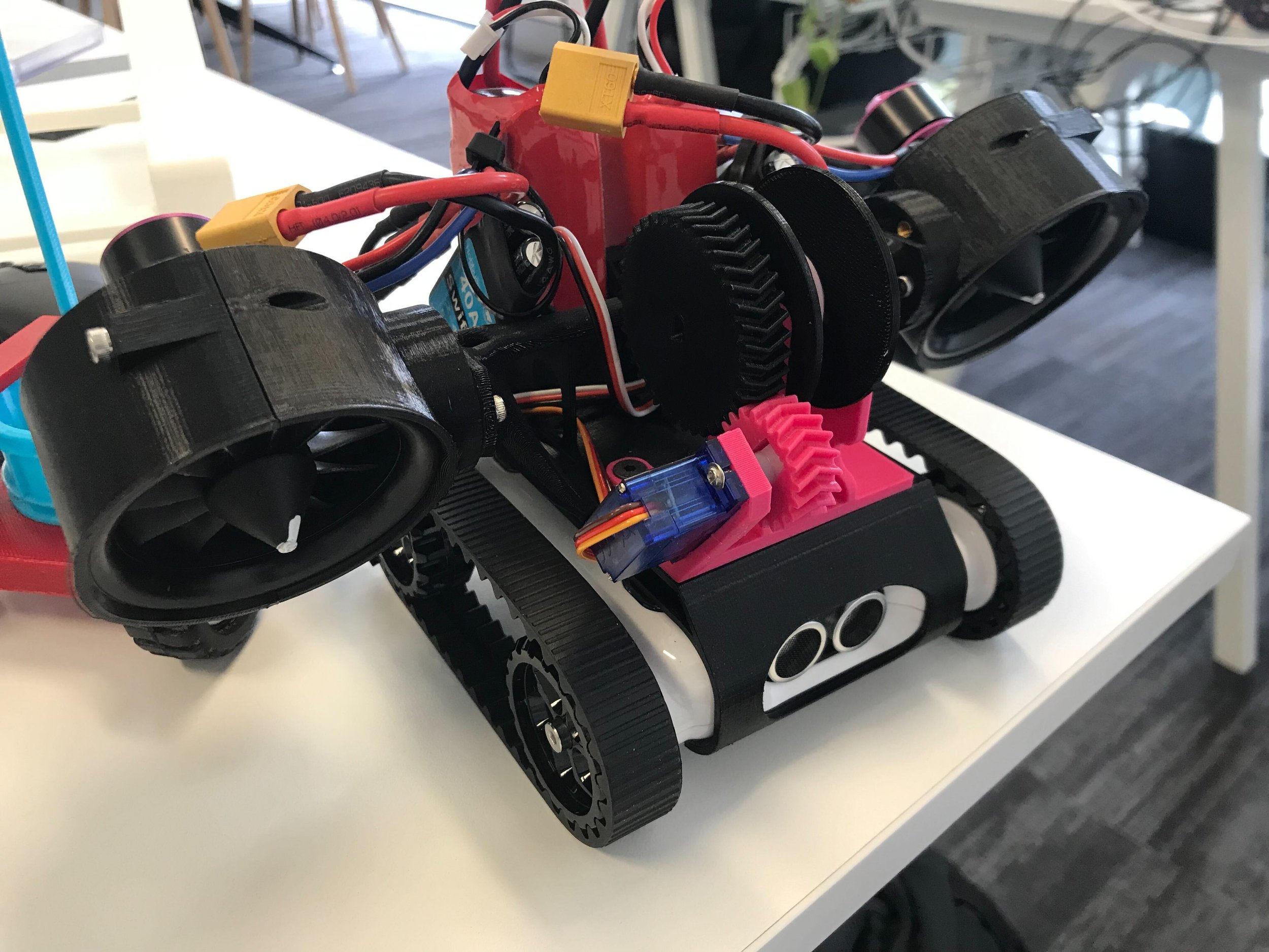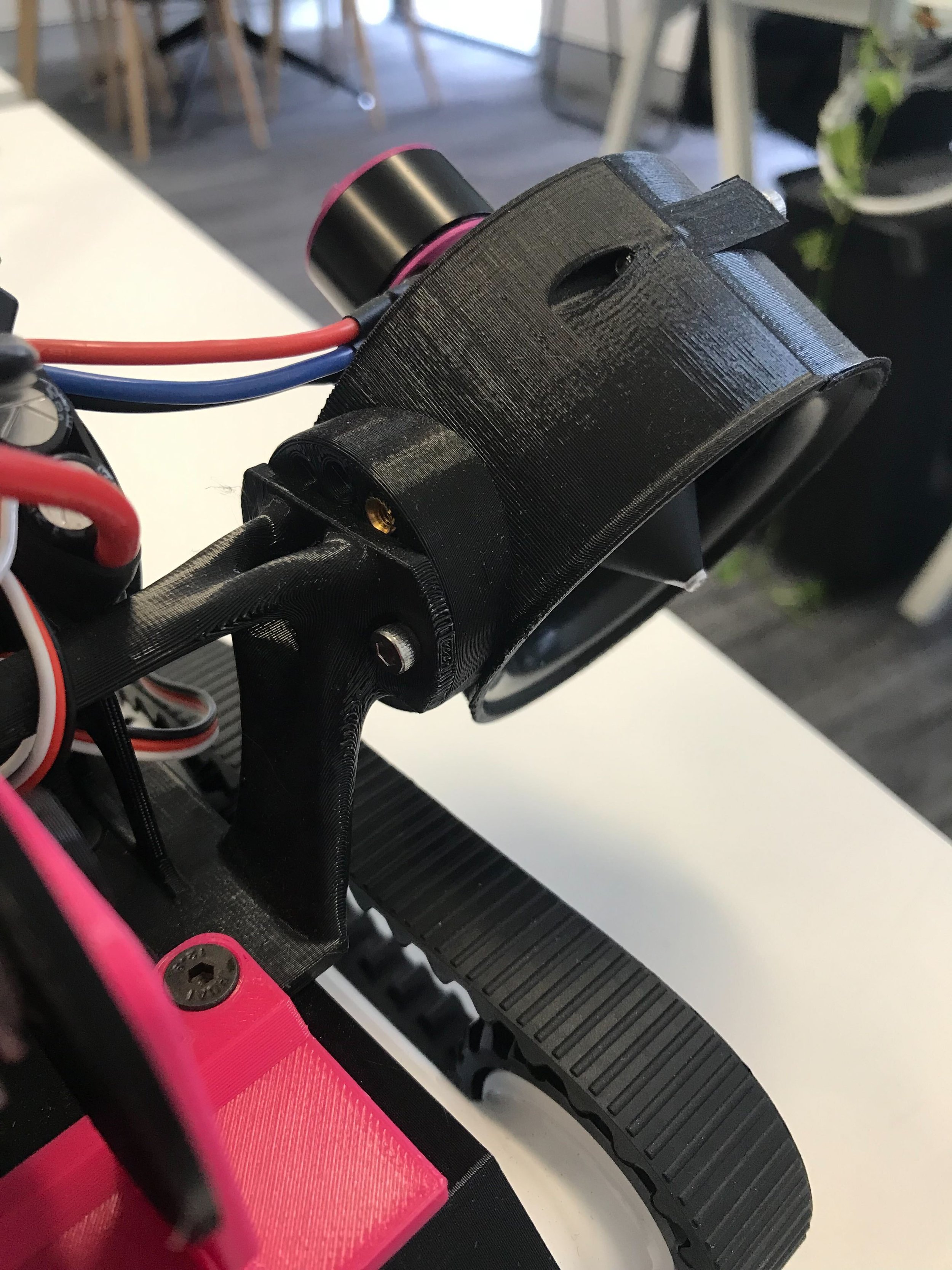 Realising that the tracks weren’t able to move the rover up the ramp, a sort of VTOL design was incorporated and the EDFs were tilted forwards. This means that the EDFs are now pushing the robot up the ramp as well as into the ramp. Because of this, the rover movement gets a massive power boost so we have to be careful otherwise it might shoot off uncontrollably (has happened). Some other small edits were made to make the structure stronger and neater in terms of cable management. A winch was also added to the front of the robot so that the flag can be pulled up to the summit once the rover is at the top.