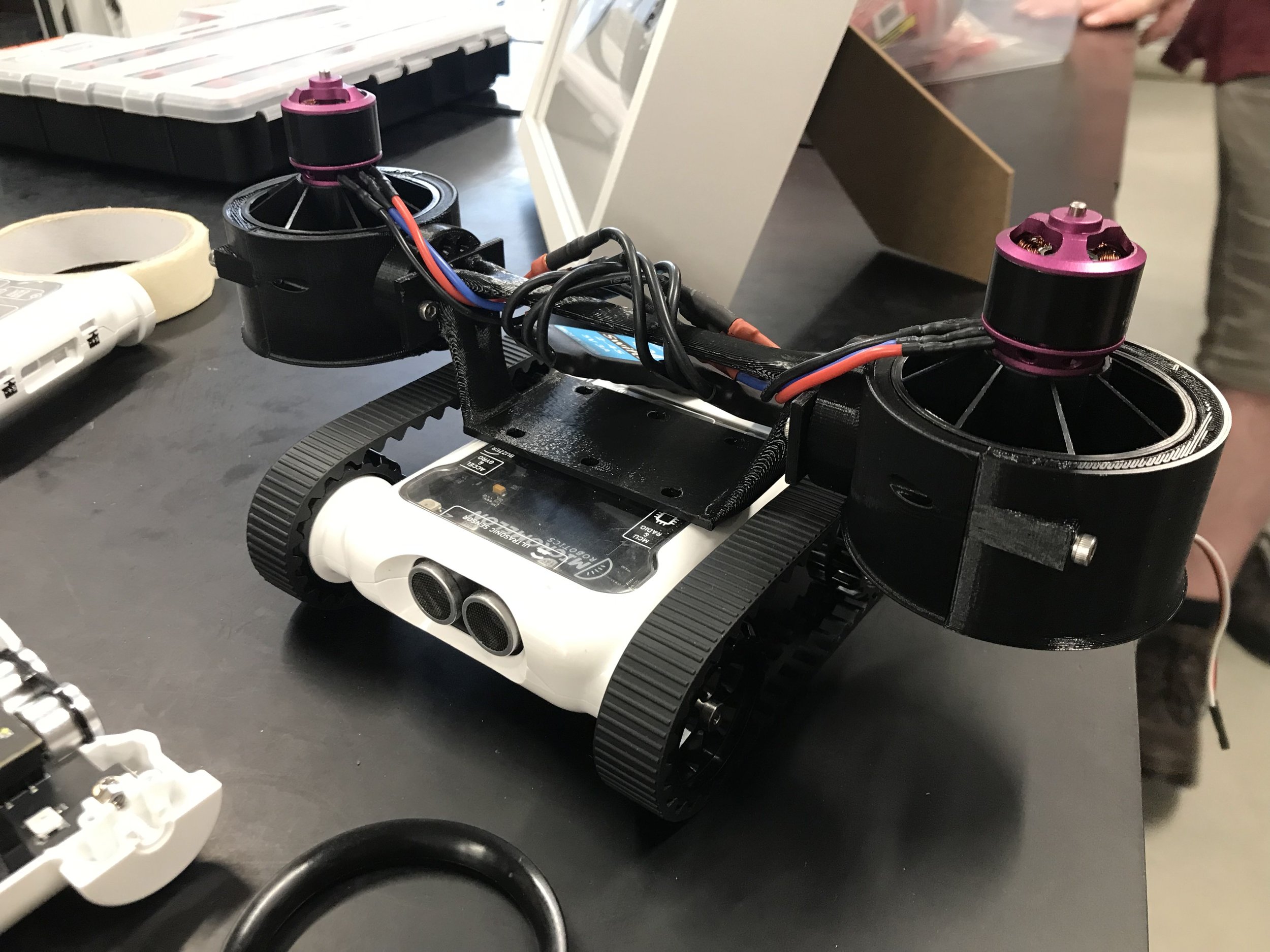 For this design, the standard quadcopter propellor was replaced with 2 EDFs. These are much larger fans that are capable of producing far more thrust, however they are much heavier and consume a lot more power. Due to this, each EDF was powered with its own battery which adds even more weight. To balance the force of the 2 fans, they were attached on either side of the rover. Another benefit of this placement is that the fans can not only create downwards thrust, but they can also make a suction effect to the ground, which will properly sick the rover to the ground.