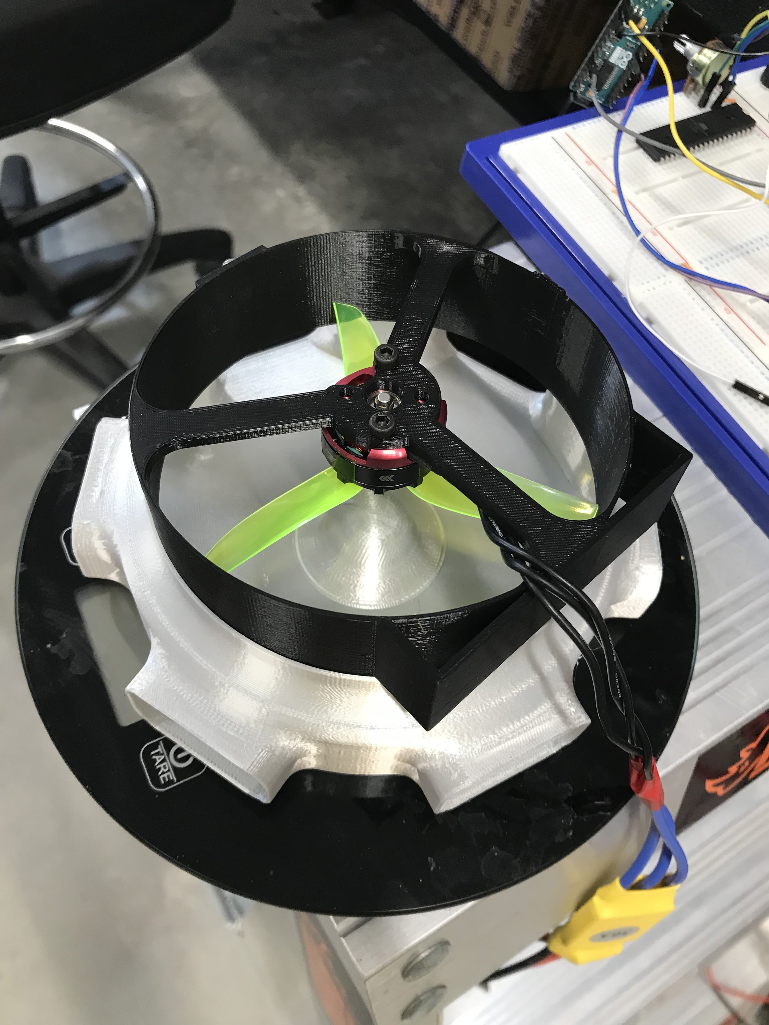 Prototype 1 has been labelled the ‘Spicy Sombrero’. The basic idea for this one is to use drone motors and propellors to create a thrust to push the robot down. Theoretically, when the robot starts climbing the wall, it will not fall backwards as the fan will push it into the wall. By increasing the normal force acting on the rover from the ramp, we hope to increase the friction force to give it better traction.