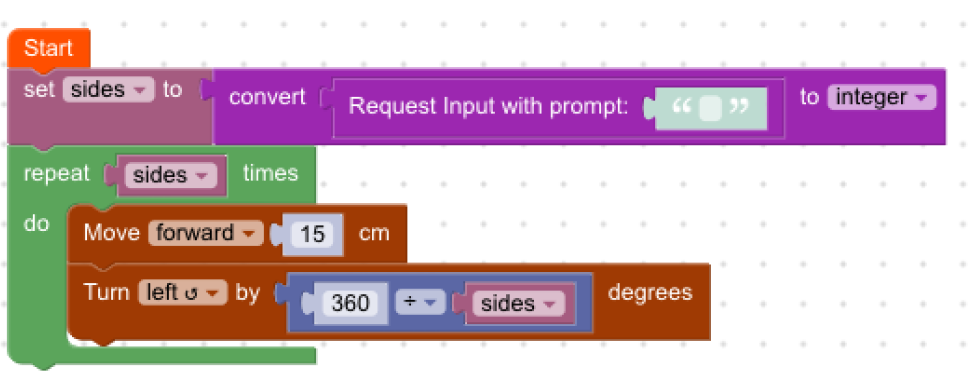 First we need to ask for a number of sides. We can use the request input block. This block returns this a text string. We need to convert it to an integer so that it can be used as a number. Once we have converted it we store the number in a variable called ‘sides’.