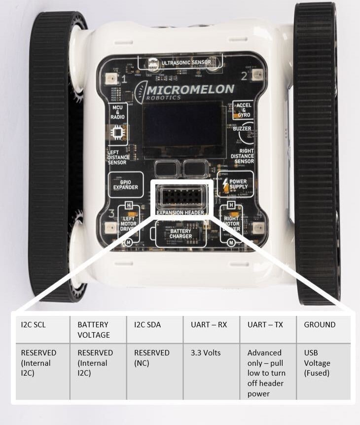 UART (universal asynchronous receiver transmitter) is a hardware communication protocol between two devices. The Micromelon Rover features an expansion header that can be used to connect external devices, such as an Arduino or an IR sensor.