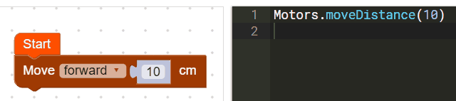 Editing The Python The Python in the Text Editor should have updated. Look to the Text Editor on the right, and you should see the code ** Motors.moveDistance(10)** on the first line. This is the same piece of code we just created with our blocks, but now it is represented in Python. All of the changes we make to the blocks will translate to Python and vice versa. Let’s edit the Python now.