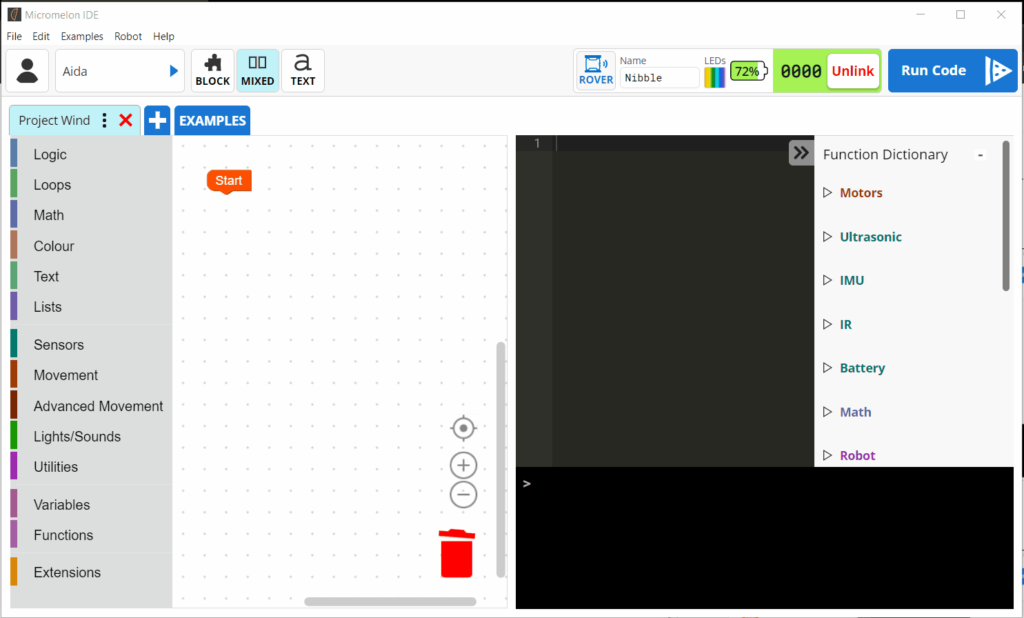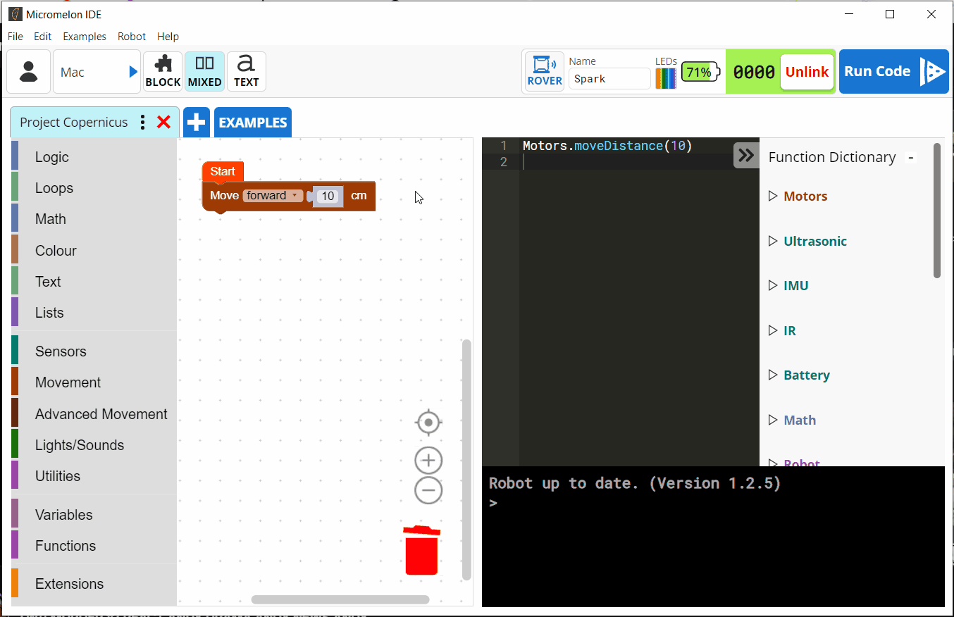 Block programming is done in the Block Editor. Drag in blocks from the** Block Catalogue**. Alternatively, you can write Python code in the** Text Editor**. You can find information on the Micromelon specific Python functions that are available to you in the** Function Dictionary**. Once you’ve written some code you can run it by pressing the** Run Code ** button. The code will be executed by the Rover connected to your Code Editor. Any errors or print messages will appear in** The Console**.