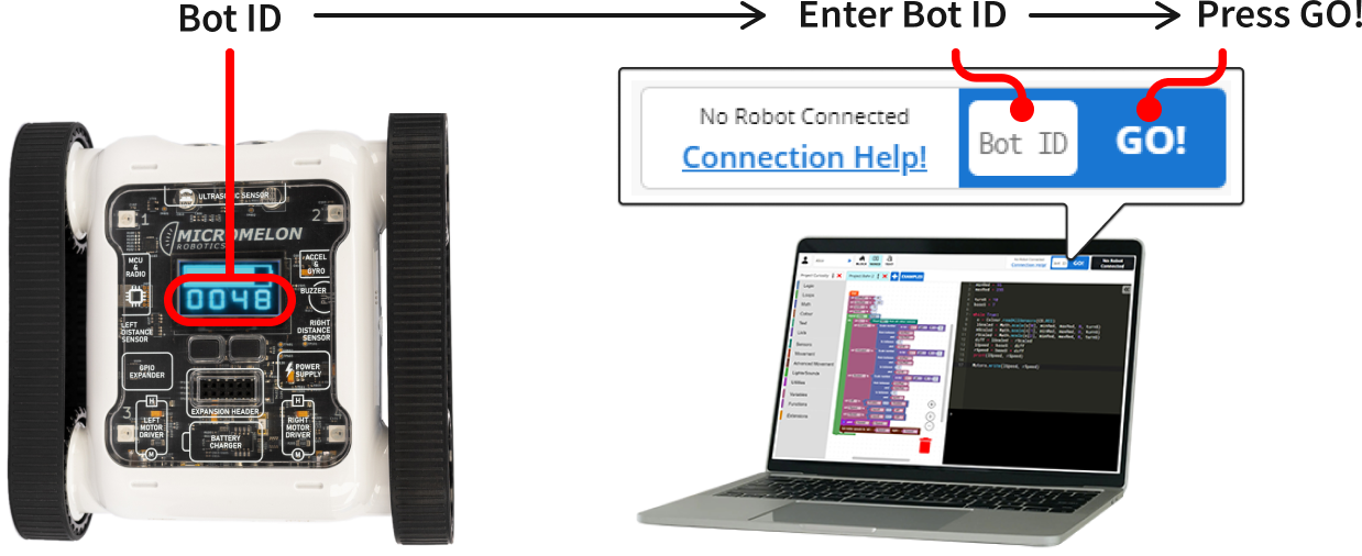 Now that your Code Editor is set up, you can connect to a Rover and begin coding. Make sure your device’s Bluetooth is turned on as Bluetooth is required to connect to a Rover. Once your Bluetooth is on, turn the Rover on. The 4 digit number on the Rover screen is the Bot ID. Enter the Bot ID into the Bot ID box in the code editor and press GO!