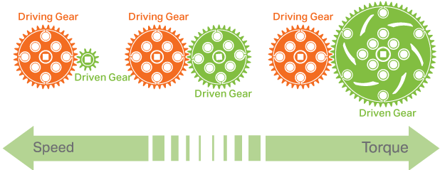As seen in the diagram above, when a driver gear has more teeth than the driven gear, the speed increases, and the torque decreases. The torque increases and speed decreases when the drive gear has fewer teeth than the driven gear. The calculation for mechanical advantage is simple: MA = # teeth driven ÷ # teeth driver.
