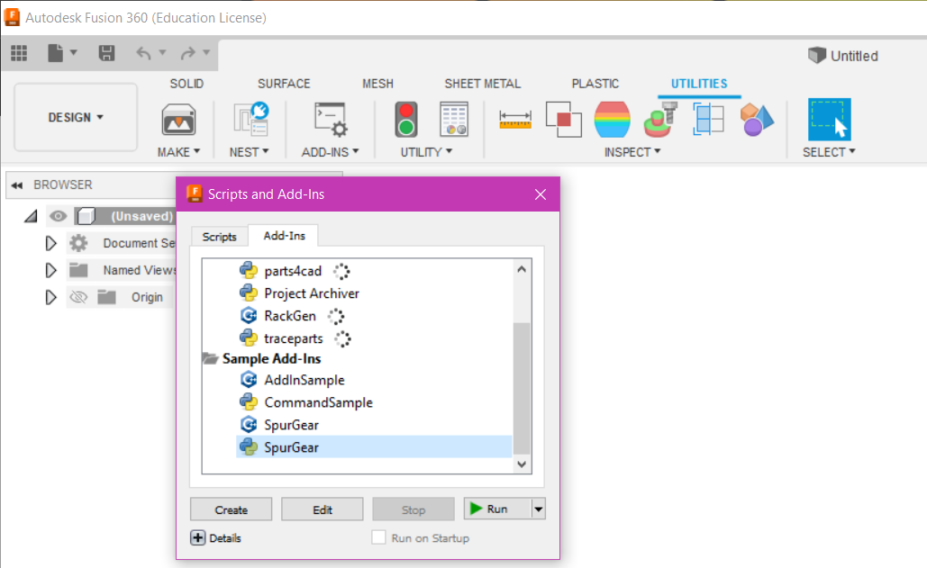 While designing gears traditionally is possible, in this guide, we’ll be going through how to use the Spur Gear Add-in from Fusion 360. As seen below, on a new Fusion part, navigate to Utilities > Add-ins > Add-ins > Spur Gear (there will be two, either will work).