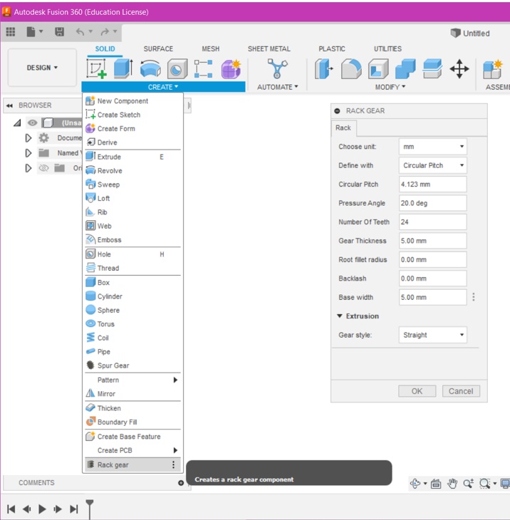 To start designing racks in Fusion, we need to install the ‘Rack Gear Generator’ created by Niklas Pöllönen (Link Here). Click the link and follow the appropriate installation instructions for your device. Once installed, the rack gear option should appear under the create tab in the solids section. Click on it, and you should find the following pop-up.
