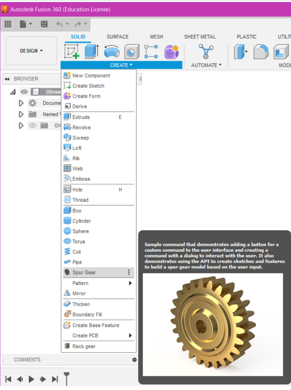 Now, back in the Solid section, under the create tab, you will find the new spur gear tool. Note that the process above must be repeated for each new part. Click on the spur gear option, and the menu below will appear.