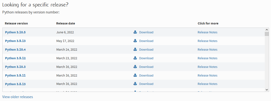You first need to install a version of the Python programming language equal to or above version 3.8. For the purposes of this guide, we will be using the newest release of python 3.10, version 3.10.5. You can find all available versions of Python by visiting the following link: https://www.python.org/downloads/