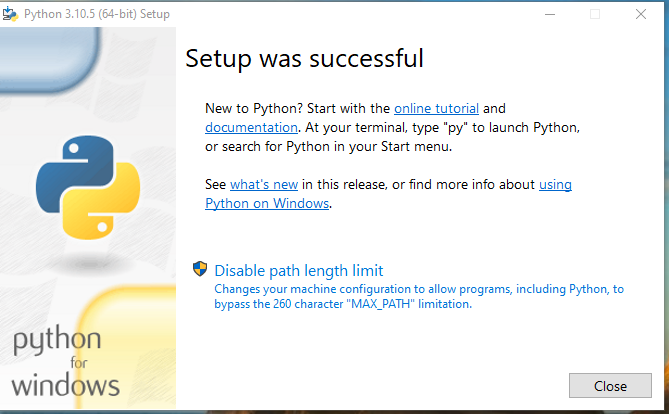Once python has finished installing, you will be shown the following screen. Click on “Disable Path Length Limit” to ensure that Python will be accessible from the command prompt.