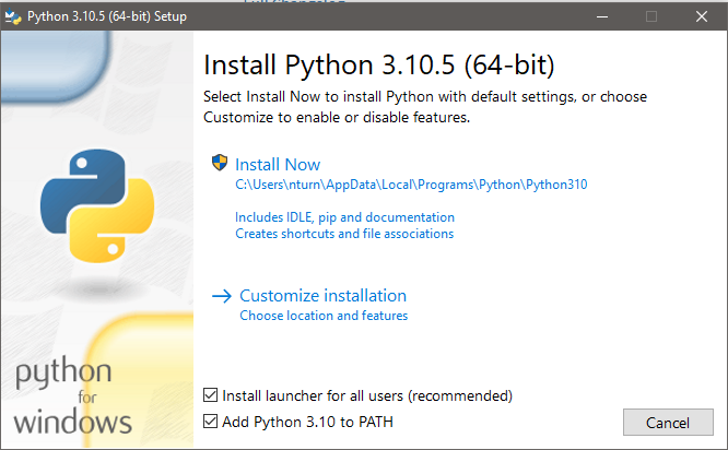 Double-click on the installer once the file has finished downloading, and you should be greeted with the python Setup window. Ensure that the “Add Python 3.XX to PATH” check box is ticked down the bottom and click “Install Now”.