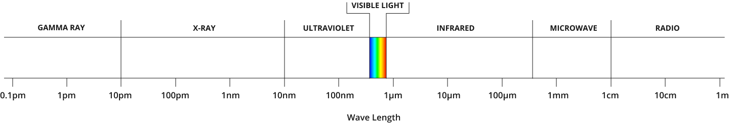 All types of light are made up of something called electromagnetic waves. The science behind electromagnetic waves and how we see them is complicated, for now all we need to know is that they exist and they’re all around us. Electromagnetic waves vary in length, similar to how there are big waves and small waves at the beach. The diagram below shows the entire range of electromagnetic wave lengths.