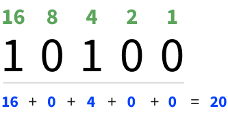 The number 20 in binary is written 10100. We turn ON the fifth and third digit. The value of the fifth digit is 16 and the value of the third digit is 4. Together they equal 20.