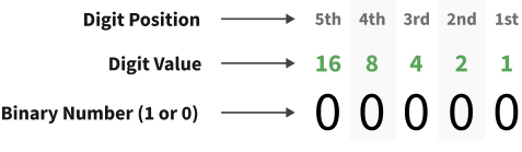 Each binary number is made up of digits each with their own value. Each digit can either be 1 or 0. If a digit is 1, that digit is ON. If it is 0, it is OFF. To get the final number you add together the values of the ON digits. Below we can see the value of the first 5 binary digits.