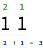 The number 3 in binary is written 11. We turn ON the first and second digit. The value of the first digit is 1 and the value of the second digit is 2. Together they equal 3.