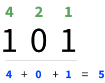 The number 5 in binary is written 101. We turn ON the first and third digit. The value of the first digit is 1 and the value of the third digit is 4. Together they equal 3.