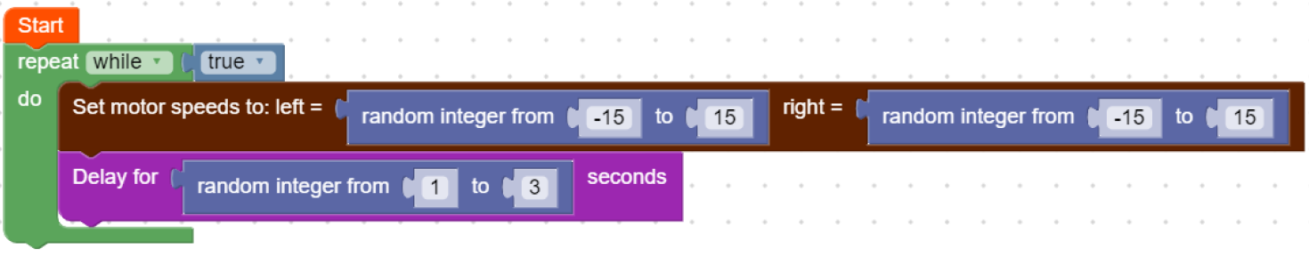 We need to control how long our rovers run at this speed. We can use the delay block to tell our code to continue what it’s doing for now. To continue the trend of our rover being unpredictable we will use another random integer block to set a random number between 1 and 3 for the amount of seconds our rover will move.