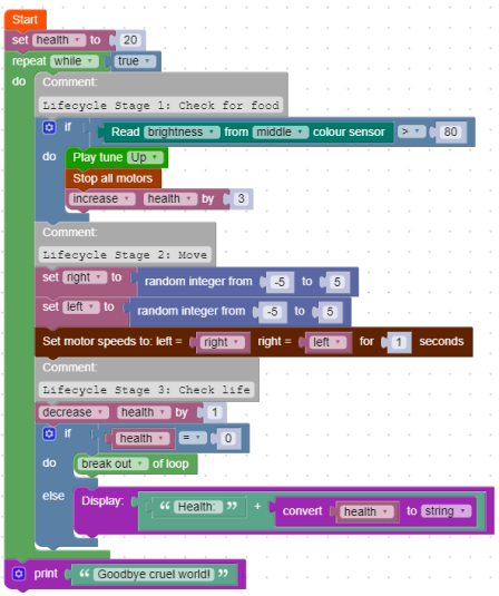 There will be three stages to our lifecycle. Firstly, our bug bot will look for food using the colour sensor block. If it detects the colour of our food with the sensor we add 3 to the health variable and play the confirmation sound.