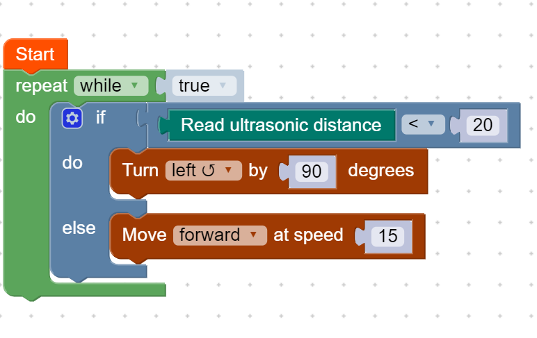 Use an IF statement block with a logic comparison block to check if the ultrasonic sensor detects an obstacle in front of the rover.