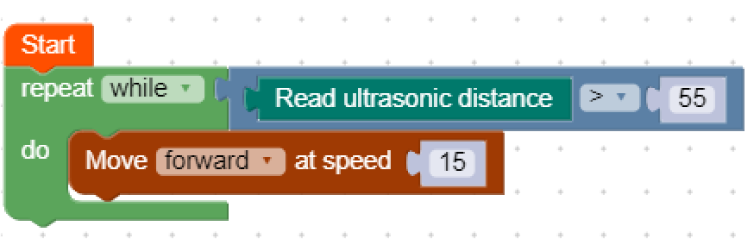 The first solution involves using the ultrasonic sensor. We use a repeat while true block, but instead of leaving it on true we tell it to repeat while the ultrasonic sensor detects a number larger than 55. Once our rover detects the warning wall suspended above the spikes within 55cm it means we are directly in our safe zone and can stop moving.