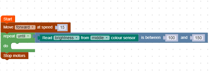 As the rover drives forward, we need to be constantly checking the colour sensor. Use a repeat until loop block where the condition is set to detect the desired colour. Our code is looking for the brightness of the white tape.