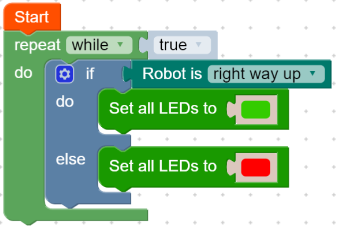 If our condition is true (the robot is the right way up) we want to use a Set All LEDs block and make all the LEDs green. If our condition is not true (the robot is upside down), use the ELSE part of the IF statement to set all our LEDs to red.